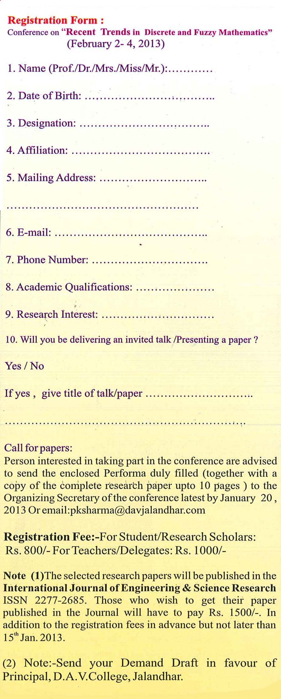Organised by Post-Graduate Department of Mathematics DAV College, Jalandhar 144 008 (Pb.)